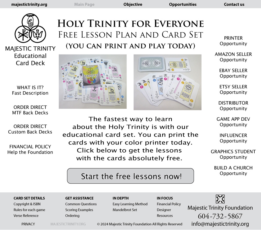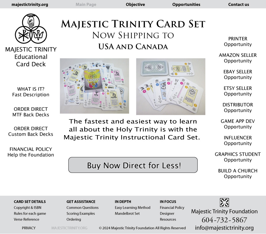 Majestic Trinity Foundation educational card set teaches all about the Holy Trinity. The attributes of the Father, Son and Holy Spirit are represented graphically to easily learn and understand.